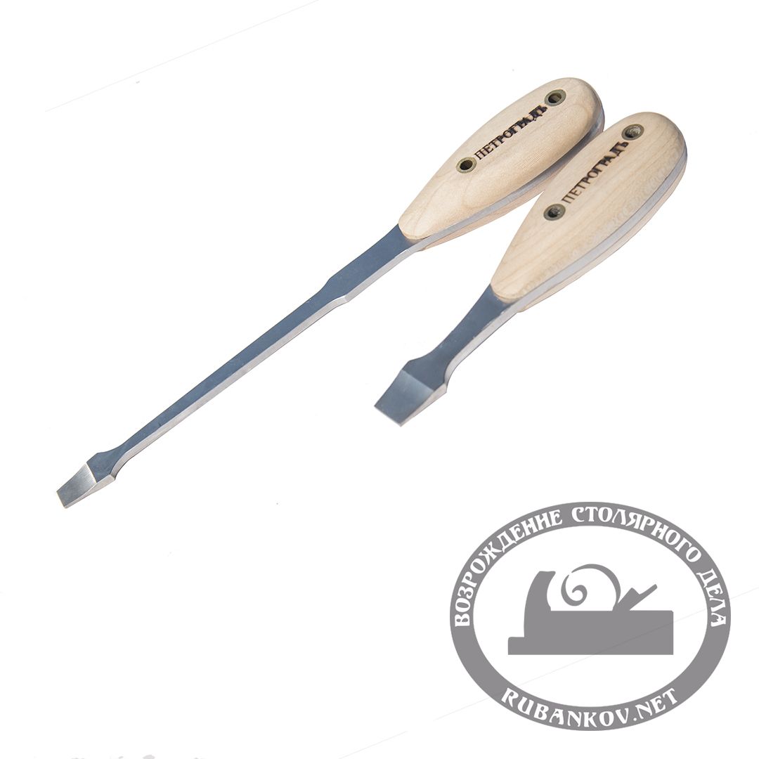 Первая модель отвёртки ПЕТРОГРАДЪ, (для установки рукоятей) прямой шлиц. Общая длина отвёртки 125 мм, ширина жала 10 мм, толщина жала 1.4 мм. Отвертка специально разработана для затягивания винтов рукоятей и прижимного винта на рубанках (кроме 1), также подойдет и для других задач. Точно подходит под размер шлица винтов рубанка, что дает необходимую силу без соскальзывания и срыва шлица на мягких латунных винтах. Материал полотна закаленная сталь 9ХС с твердостью 56 -58 HRc, рукоять выполнена из ясеня и собрана на латунные заклепки.