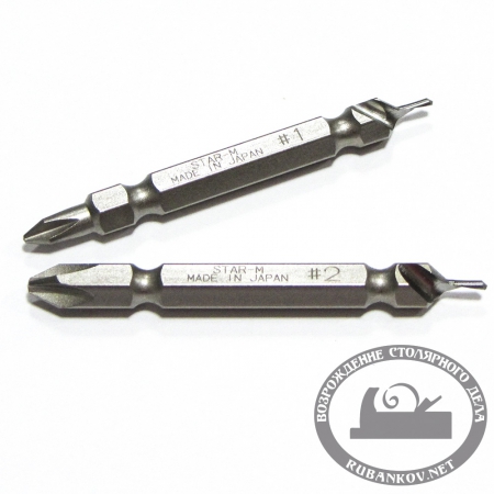 Отверточные насадки модели 5009 производителя STAR-M предназначены для правильного крепления потайными шурупами листового металла без замятия последнего. Одна сторона имеет сверло диаметром 1,5 мм которое сверлит направляющее отверстие для шурупа, а также зенковку. Зенковка получается идеально соосно - Ваш шуруп никогда не уйдет в сторону, а правильный угол зенковки в 90 град. позволяет не заминать металл. Достаточно перевернуть насадку и можно сразу заворачивать шуруп. Выпускаются двух типов: с наконечником PH1 и PH2. В комплекте по 2 шт. Длина насадок 65 мм, длина сверла вместе с зенковкой -8,5 мм. Производство - Star-M (Япония)