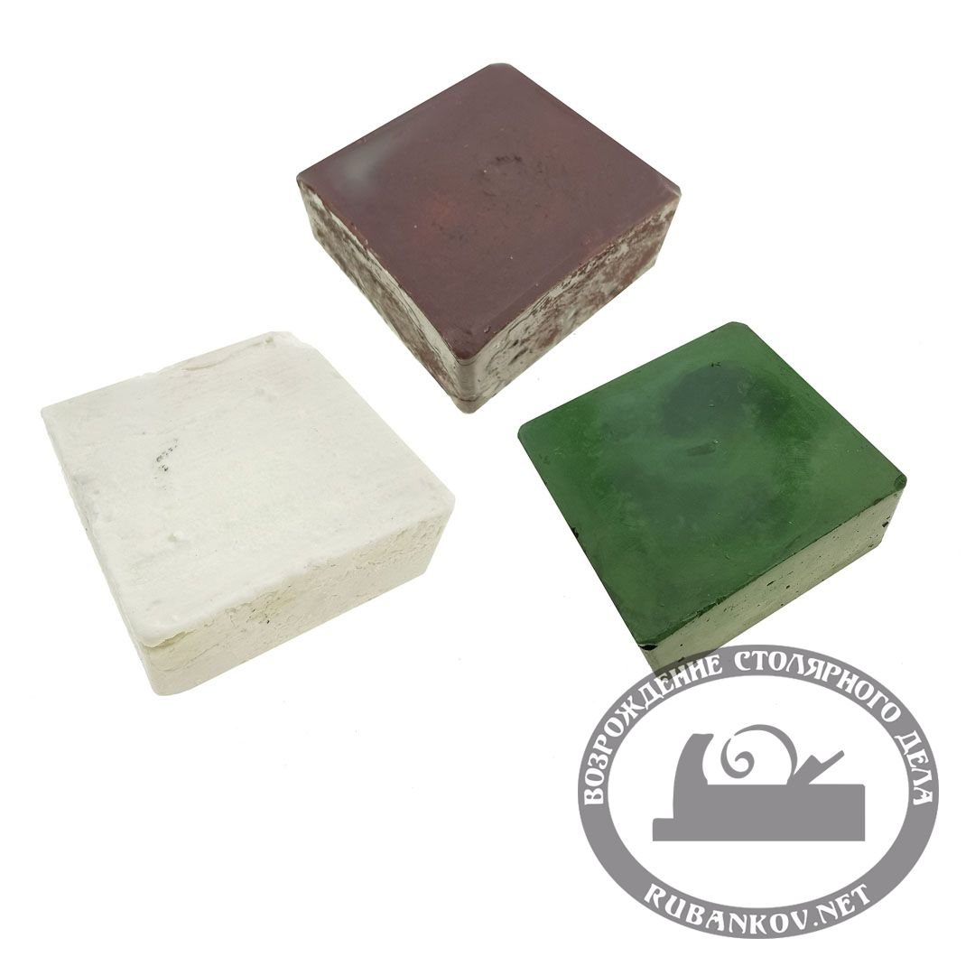 Воскообразные полировальные пасты в виде прямоугольного бруска. Размеры - 60x60x15мм. Зернистость - крупная, средняя и мелкая. Белая - 600грит, коричневая 1200грит, зеленая 2000грит. Масса - 180г. Используется для шлифовки и полировки на кругах, ремнях и т. п. Отлично подходят для ручных кожаных брусков Петроградъ.