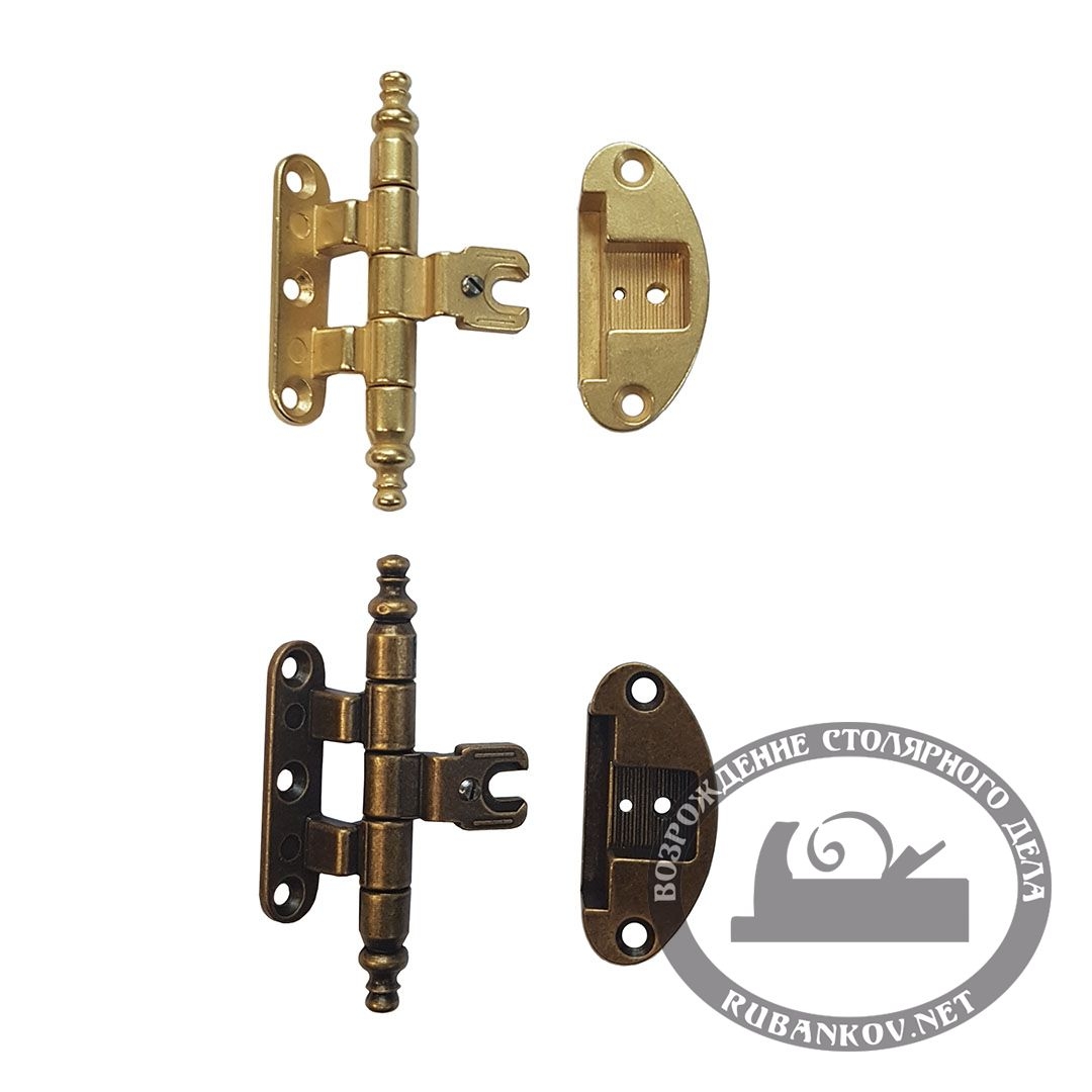 Петли врезные изогнутая. Размеры: 50*80мм. Материал - сплав Zamak. Состоит из двух деталей: петля и ответное крепление. Цвет - латунь темная и светлая. Производитель: Metal Group (Италия)
