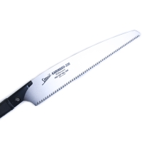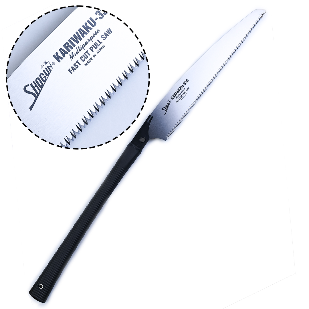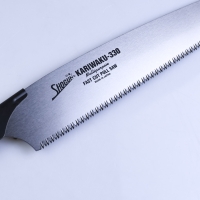Пила безобушковая Shogun Kariwaku Saw. Длина полотна - 330мм, толщина полотна - 0.9мм, ширина - 55мм, толщина пропила 1,4 мм. Общая длина пилы - 700мм. Трапециевидный зуб (шаг 2.72мм). Хорошо пилит волокна по диагонали, а также сырую древесину, фанеру, ламинат. Легкая алюминиевая рукоять покрытая резиной. Производство Miki Tool (Япония).