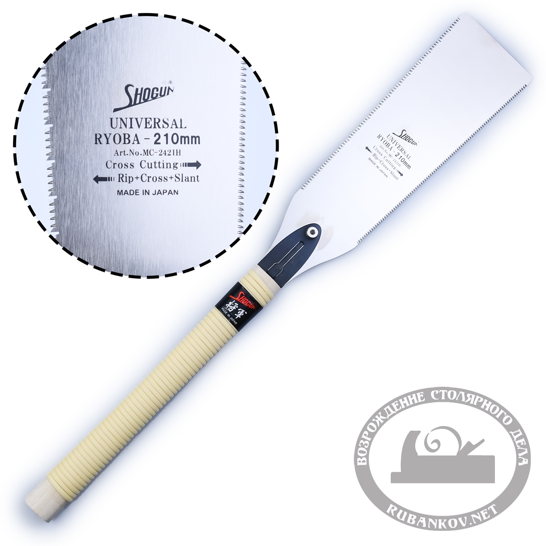 Пилы Shogun Ryoba Universal, Rip/Cross/Slant. Универсальная пила для продольного и поперечного раскроя материала. Полотно с возможностью замены надежно фиксируется винтом.Зубья направлены к рукояти. Деревянная рукоять обернута искусственным ротангом (имитация из пластика). Производство Shogun (Япония).