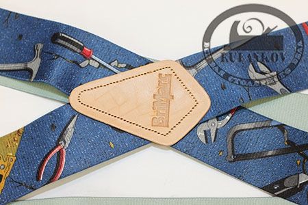 Цветные подтяжки с мощными клипсами. Ширина подтяжек - 50мм. Цвета - желтый, синий, красный. Универсальный размер. Позволяют прикрепить наряду с поддержкой брюк еще и инструментальный ремень, сумку-скрутку или садовый фартук. На желтые и красные подтяжки нанесен рисунок в виде линейки с изображениями различного инструмента, на синих только изображения инструмента. Производство - США