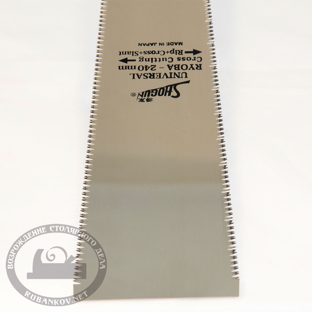 Запасное полотно для пилы Shogun Ryoba .Имеет зубья для продольного и поперечного раскроя материала. Длина полотна - 240мм, ширина - 75мм, толщина - 0.6мм. Шаг зубьев для продольного пиления - 1.8мм;для поперечного - 1,6мм. Покрытие - хромирование. Зубья направлены к рукояти. Производство - Япония.