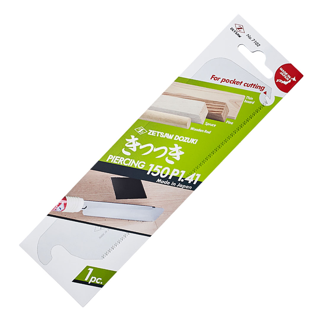 Полотно для пилы обушковой Z-Saw Dozuki Piercing, 150мм, 18tpi, 0.3мм. Полотно для обушковой пилы предназначено для точных чистовых работ по твердым породам древесины. Для идеального запиливания поперек волокна древесины. Первый зуб дает возможность запиливаться в середине материала. Максимальная глубина пропила 38мм. Длина полотна - 150мм, толщина полотна 0,3мм. Шаг зубьев - 18 на дюйм. Трапециевидный японский зуб с импульсной закалкой позволяет работать по твердым породам древесины. Зубья японской пилы направлены к рукояти, что позволяет легко запиливаться и получать ровный рез и чистый рез. Используется для поперечного и комбинированного реза. Эта пила не требует заточки и готова к работе.