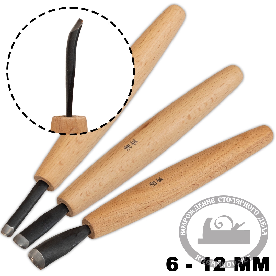 Полукруглые изогнутые стамески для резьбы по дереву от японского производителя Seigen. Используются для плоско рельефной резьбы по дереву и детализации барильефной резьбы и малых скульптур. Выполнены из качественной двухслойной стали с закалкой до 62HRc. Ручки овальной формы выточены из древесины бука и удобно лежат в руке. Производство Seigen (Япония)