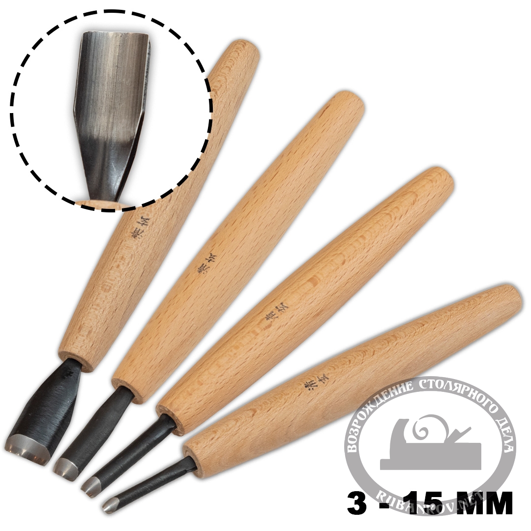 Полукруглые стамески для резьбы по дереву от японского производителя Seigen. Используются для плоско рельефной резьбы по дереву и детализации барильефной резьбы и малых скульптур. Выполнены из качественной двухслойной стали с закалкой до 62HRc. Ручки овальной формы выточены из древесины бука и удобно лежат в руке. Производство Seigen (Япония)