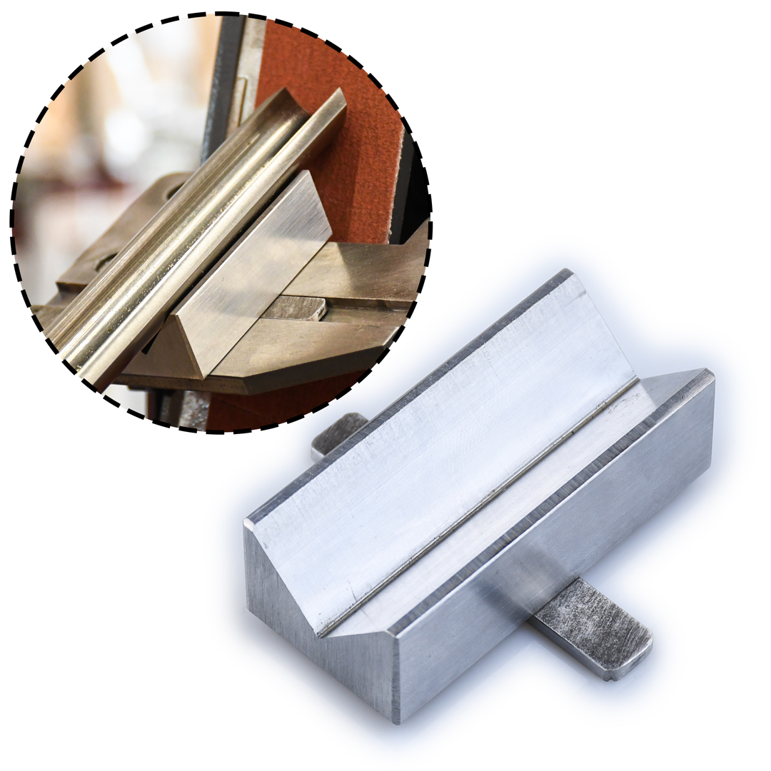 Приспособление для заточки полукруглых стамесок на гриндерах Robert Sorby и ПЕТРОГРАДЪ. Приспособление имеет V - образное ложе. Позволяет легко производить заточку токарных полукруглых резцов и полукруглых стамесок. Устанавливается на опорный стол. Производство – фабрика Петроградъ (Россия).