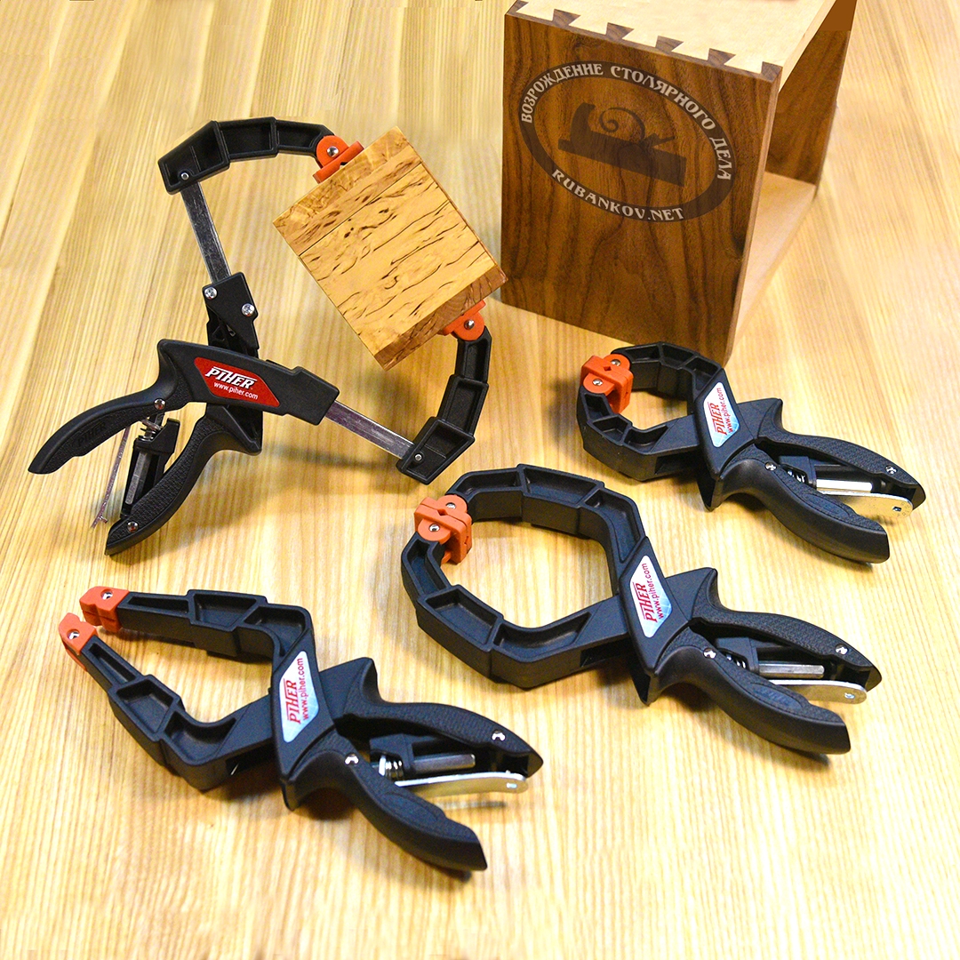 Пружинные зажимы с фиксацией с размером раскрытия от 0 до 160 мм на модели с телескопическими губками и рабочей глубиной до 85 мм. Эргономичные ручки очень удобны для работы одной рукой с возможностью снятия фиксатора одним пальцем. Корпус зажимов выполнен из крепкого пластика (нейлон армированный стекловолокном), шестигранная распорка из стали со стольным фиксатором. Пластиковые подвижные окончания губок. Производство - Piher (Испания).