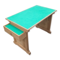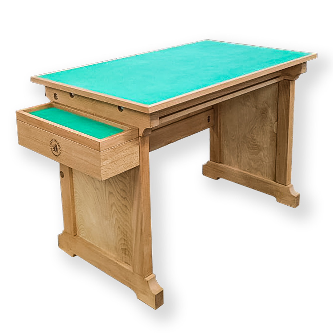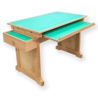 Рабочий стол лозоплетельщика. Выполнен из массива бука. Столешница имеет размеры: 1000*600 мм. Оснащен нижней выдвигающейся столешницей, а также ящиком 440*150 мм. Верхняя столешница имеет водонепроницаемое покрытие из полиэтилена высокого давления. Производство фабрика Петроградъ (Россия).