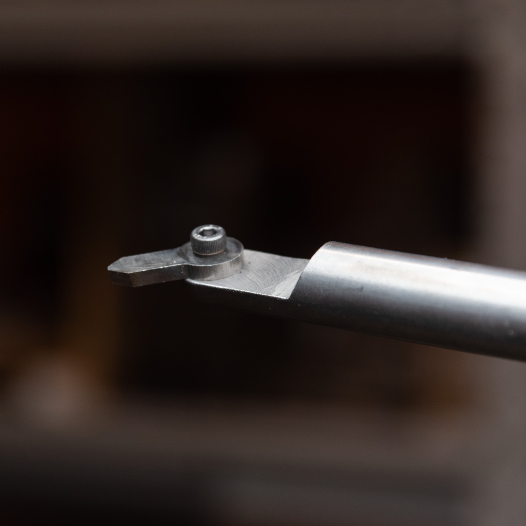 Благодаря мощной штанге расточной резец Петроградъ нивелирует вибрации, а дополнительная рукоять повышает точность контроля и мы можем добиться фактически прозрачных стенок изделия.