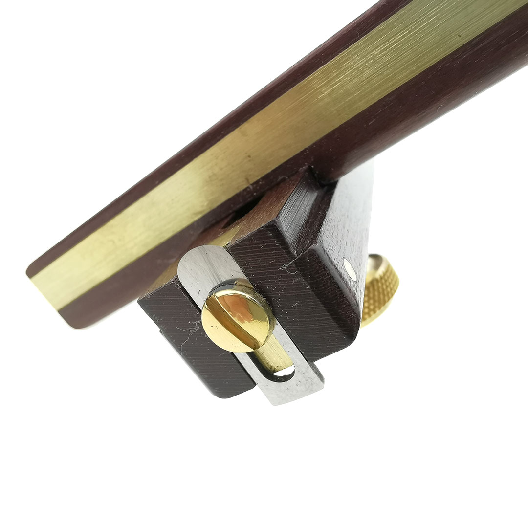 Все элементы конструкции идеально подогнаны и отполированы. Деревянные детали покрыты маслом и воском в ручную. Латунный зажимной винт с гайкой. На гайке нанесена накатка для удобства работы и красоты. Рейсмус оснащен одним ножом с полукруглой режущей кромкой. Такая заточка позволяет более точно наносить разметку вдоль волокна. Сравнительно широкая опорная колодка имеет латунную вставку, что значительно увеличивает срок службы и украшает инструмент.