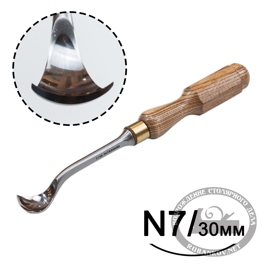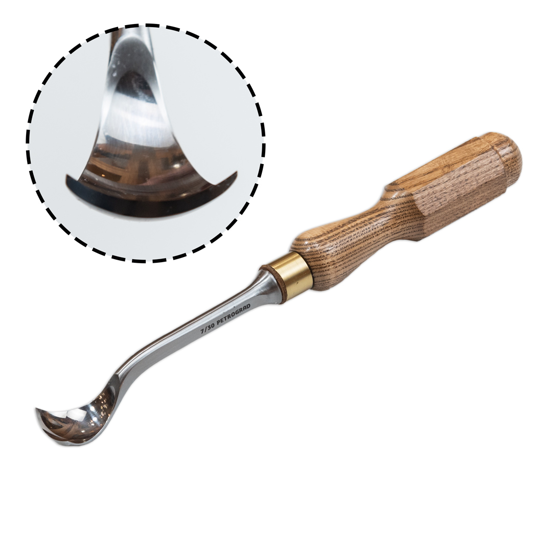 Стамески для резьбы по дереву, Петроградъ, откованы из низколегированной высокоуглеродистой стали. Закалены до твёрдости 59-61 HRc. Внутренний профиль стамески отполирован, режущая кромка заточена и готова к работе.