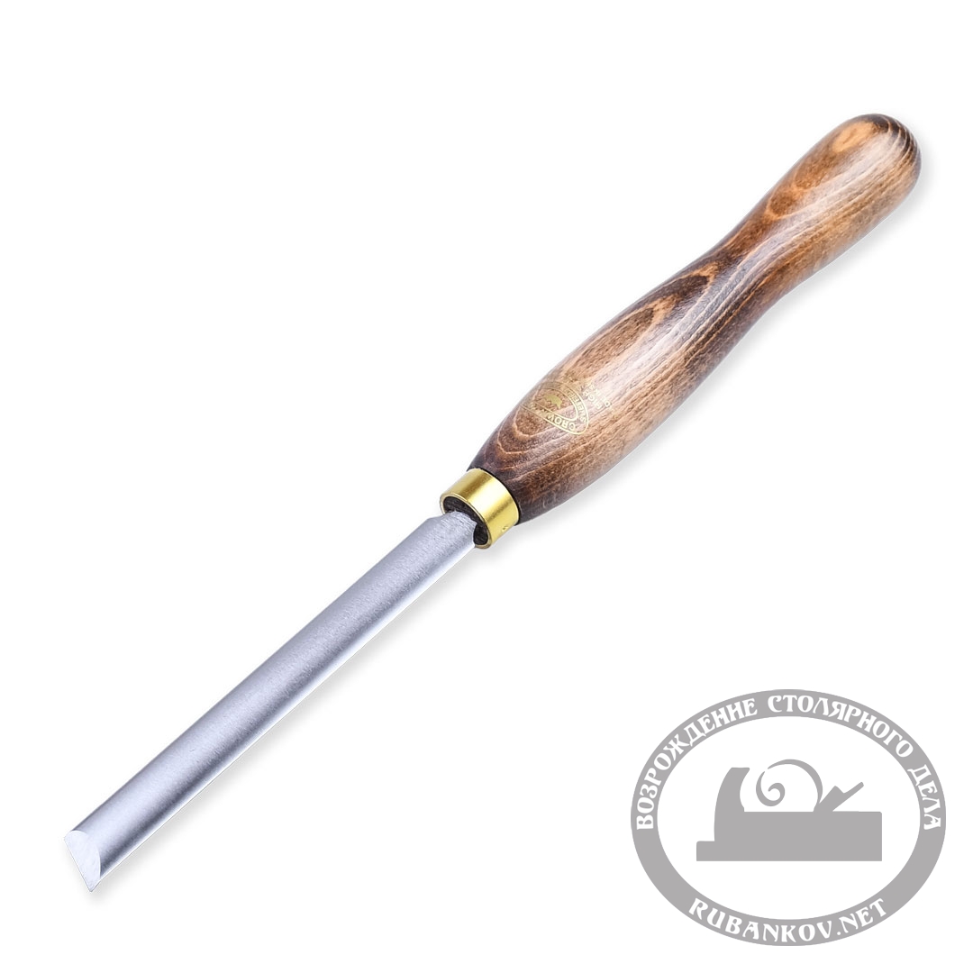 Скошенный токарный резец (мейсель) с овальным профилем, используется для финишной обработки заготовок, цилиндров, изготовления мелких кривых и V-образных канавок, валиков и т.д. (н-р при изготовлении ножек стульев). Овальный профиль позволяет резцу легко скользить по упору токарного станка. Выполнены из быстрорежущей стали (M2 HSS) твердостью 62-64 HRс, что позволяет резцам служить в 6 раз дольше, чем резцы из углеродистой стали. Ширина от 13 мм до 32мм Рукоять в месте крепления лезвия обжата латунным ободком.