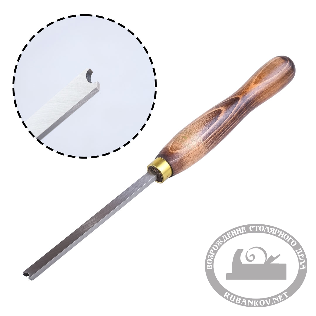 Резец предназначен для изготовления небольших валиков, заготовок под кольца и т.п. Выполнен из быстрорежущей стали. Диаметр скругления 6мм или 10 мм. Полная длина резца 380 мм. Рукоять выполнена из древесины красных тропических пород и удобно лежит в руках. В месте крепления лезвия рукоять обжата латунным ободком. Производство Crown Tools (Великобритания).