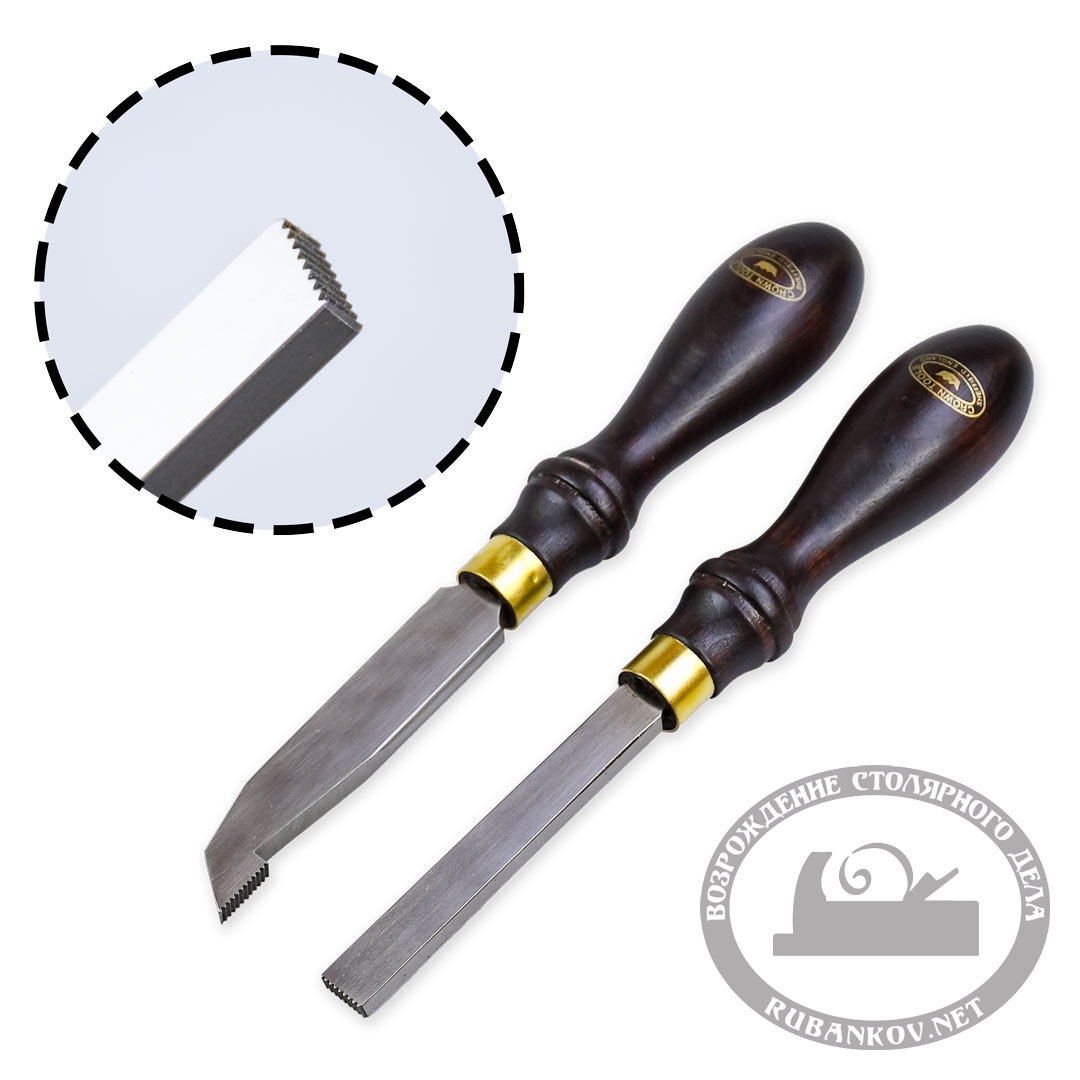 Специальные резцы для нарезания внутренней и внешней винтовой резьбы на древесине. Шаг резьбы 12 TPI или 18 TP (12 или 18 зубьев на дюйм). В комплекте 2 штуки. Эти резцы оправдывают надежды даже самого требовательного мастера. Выполнены из высококачественной быстрорежущей стали. Длина лезвия 107 мм. Полная длина резца 235 мм. Рукоять выполнена из древесины красных тропических пород и удобно лежит в руках. В месте крепления лезвия рукоять обжата латунным ободком. Производство Crown Tools (Великобритания).