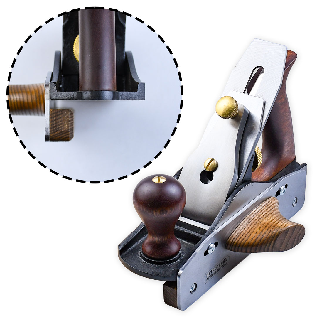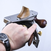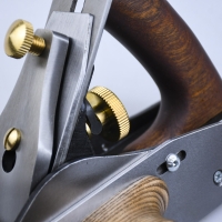 Режущая кромка заточена, но требует доведения на абразивах от 3000 и выше на угол не менее 30 градусов. При работе по твердым породам древесины рекомендуемый угол заточки ножа от 35-37 градусов для более стойкой РК. Также конструкция рубанка позволяет устанавливать ножи типа Stanley. Угол установки ножа 45 градусов. Рубанок оснащен механизмом регулировки лягушки, благодаря чему можно изменять ширину ротка без изменения настроек ножа. Также снабжен механизмом плавной регулировки вылета ножа.