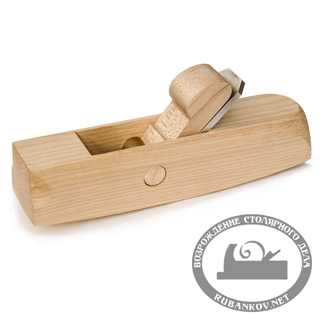 Рубанок-горбач ПЕТРОГРАДЪ, полукруглая РК. Колодка рубанка выполнена из клёна имеет вставку из латуни для надежной фиксации ножа. Покрыт грунтовочным маслом - в один слой и вторым слоем покрыто маслом и воском. Клин также изготовлен из клёна. Нож выполнен из легированной инструментальной стали 9ХС твердостью 59-61 HRC. Угол установки ножа - 45°. Размеры ножа: длина - 110 мм, ширина - 30 мм, радиус режущей кромки ножа 50 мм. Угол заточки ножа 30°. Рубанок предназначен для выборки криволинейных поверхностей, а также для создания декоративных поверхностей.