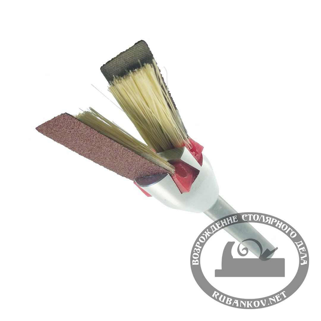 Торцевая втулку выполнена из алюминиевого сплава, шток выполнен из инструментальной стали. Оснащается шлифовальными элементами в виде абразива с опорной щеткой. Вставлять абразивные элементы необходимо в трапециевидные пазы. Зажимаются при помощи шестигранного ключа винтом внутри штока. Щётки выполняют только функцию опоры.