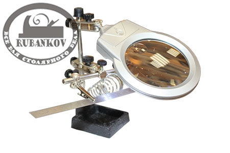 Штатив паяльный с диодной подсветкой и лупой. Диаметр большой линзы - 86мм, диаметр малой линзы - 21мм. Ширина поперечной направляющей - 120мм. Поворот лупы на 360º. 2 зажима. Утяжеленное основание с кармашком. Место под паяльник. 2 диодных лампы с питанием от 2 батареек ААА (мизинчиковые). Основное применение - зажим плат для удобства при пайке. Производство - IMEX Tools (Россия).