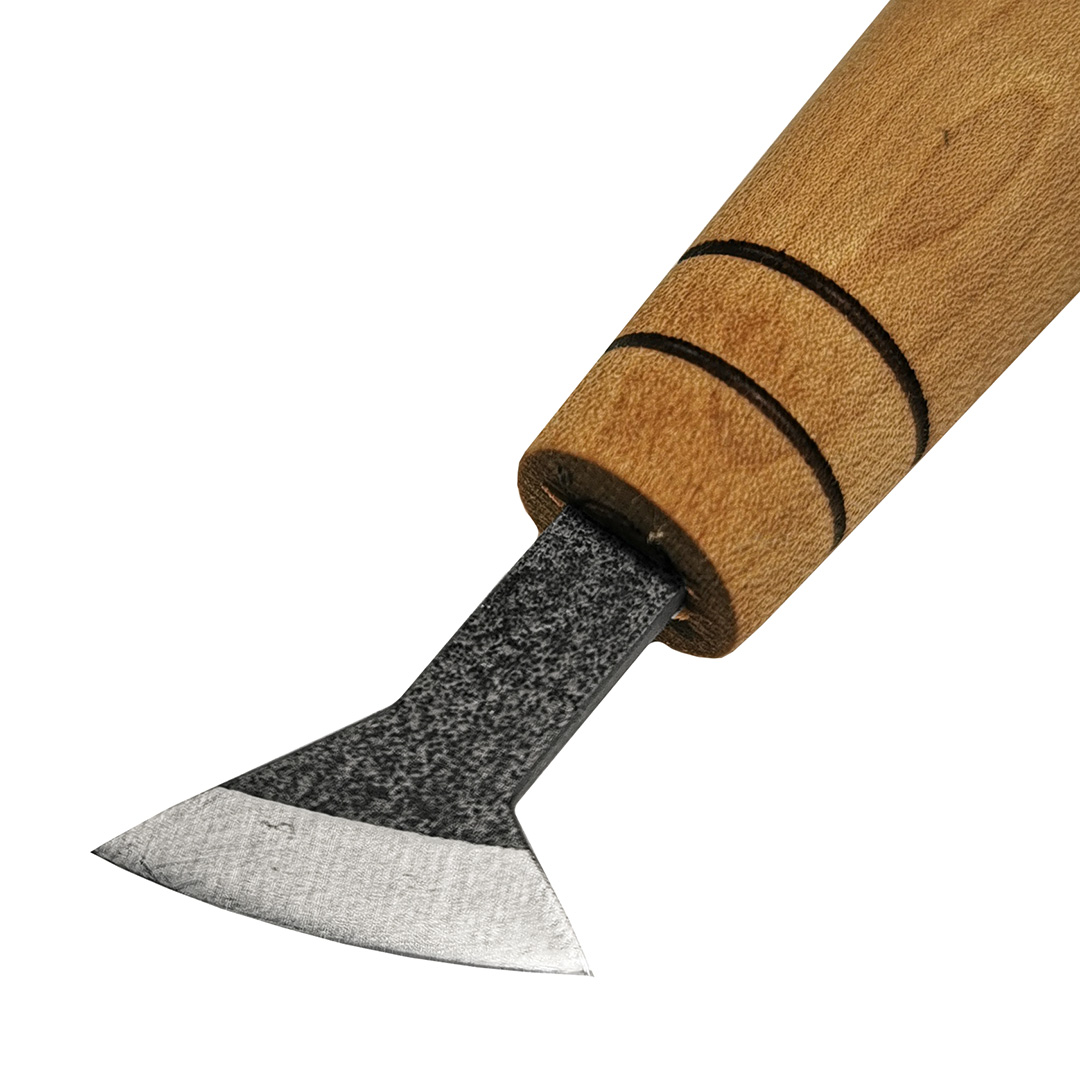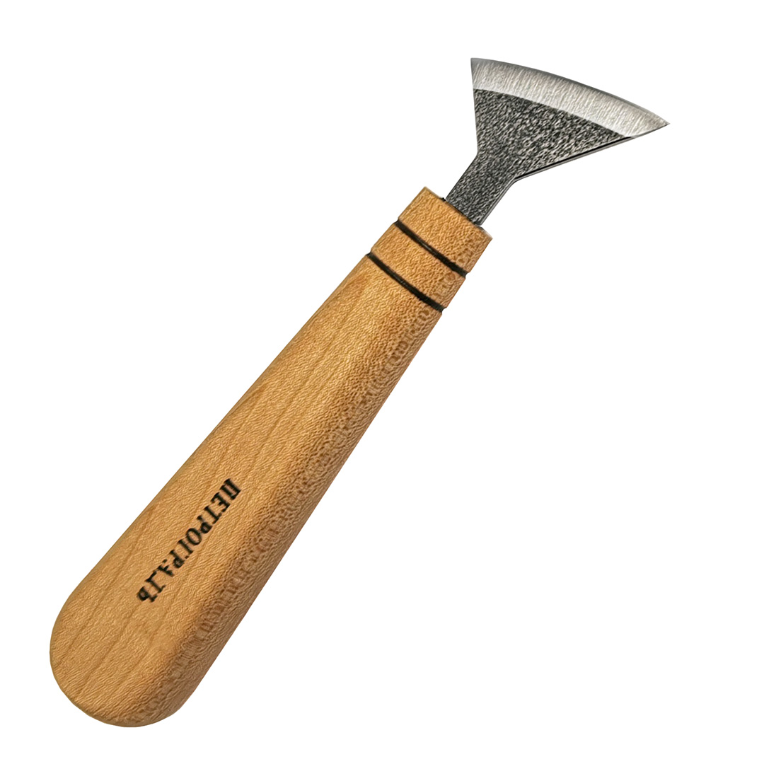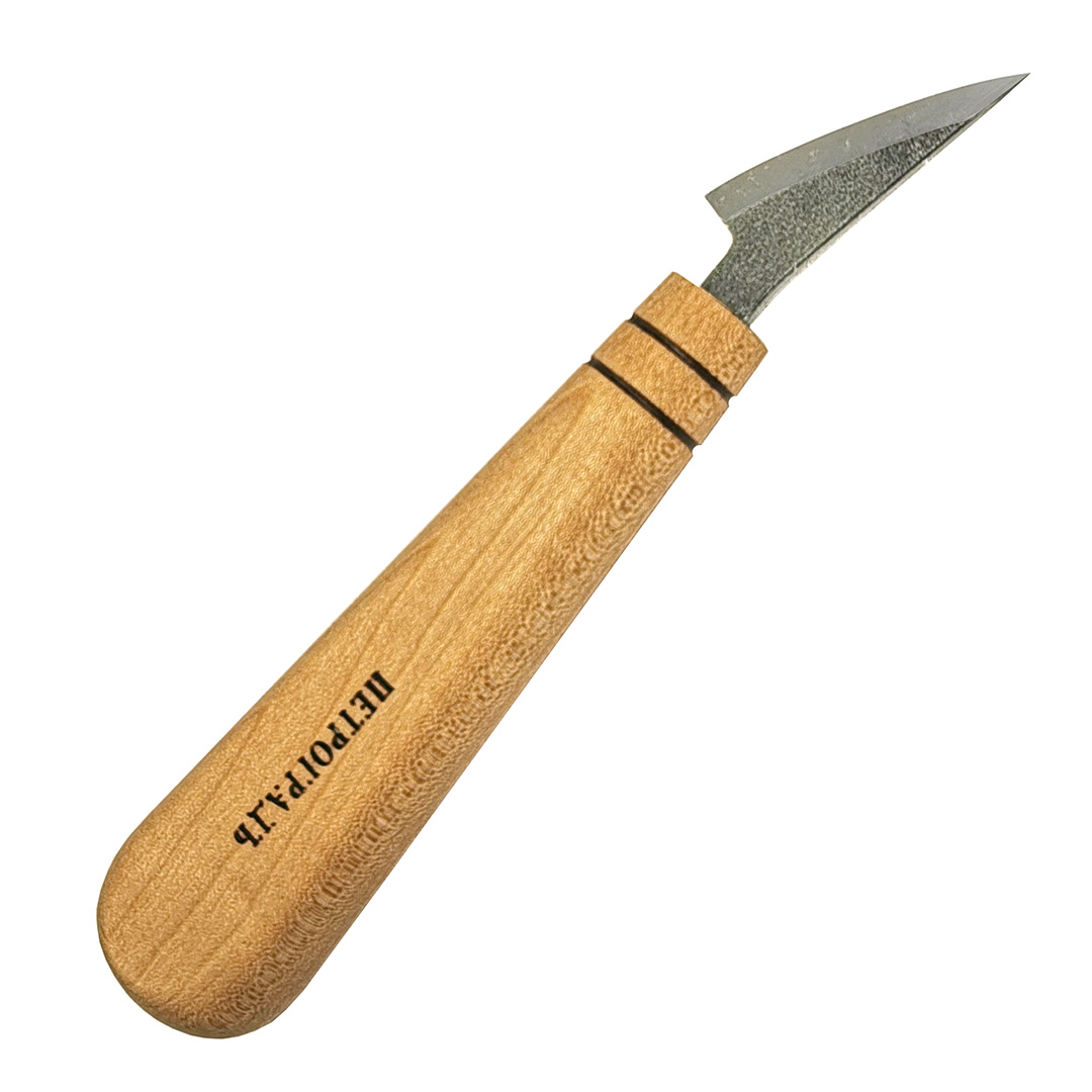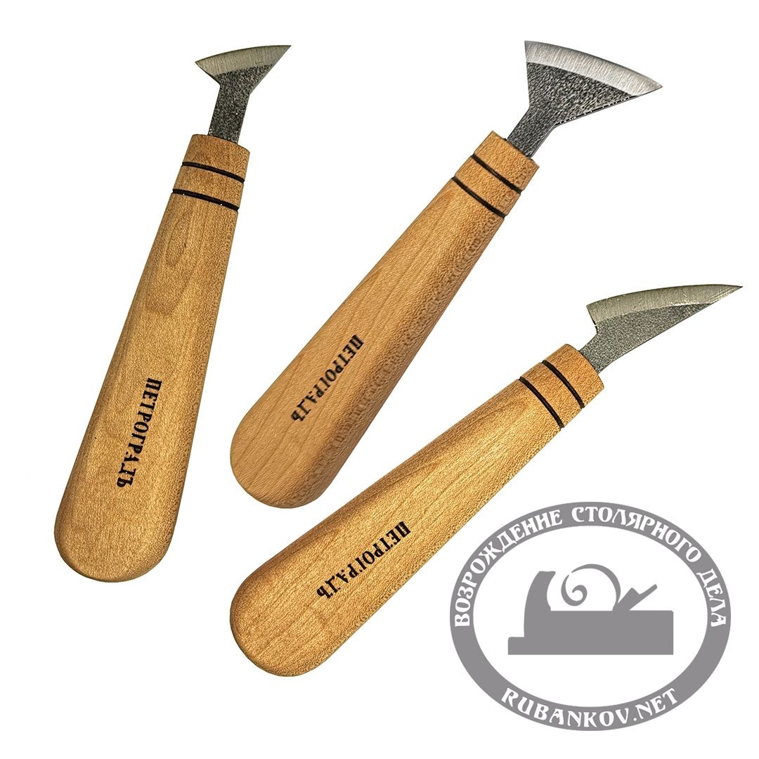Штихели резчицкие, ПЕТРОГРАДЪ. Нож-флажок предназначен для резьбы средних деталей и деталировки малых форм. Выполнены из стали 65Г. Ручки резцов имеют грушевидную форму, что позволяет надежно и удобно удерживать резец, при этом не утомляя кисть. Материал рукоятей - клён, покрыты маслом. Длина рукояти - 110 мм. Инструмент представлен линейкой резцов с полукруглой режущей кромкой с шириной рабочей части 27 мм(± 2 мм), 38 мм(± 2 мм), 43 мм(± 2 мм). Угол заточки 22,5±5°.