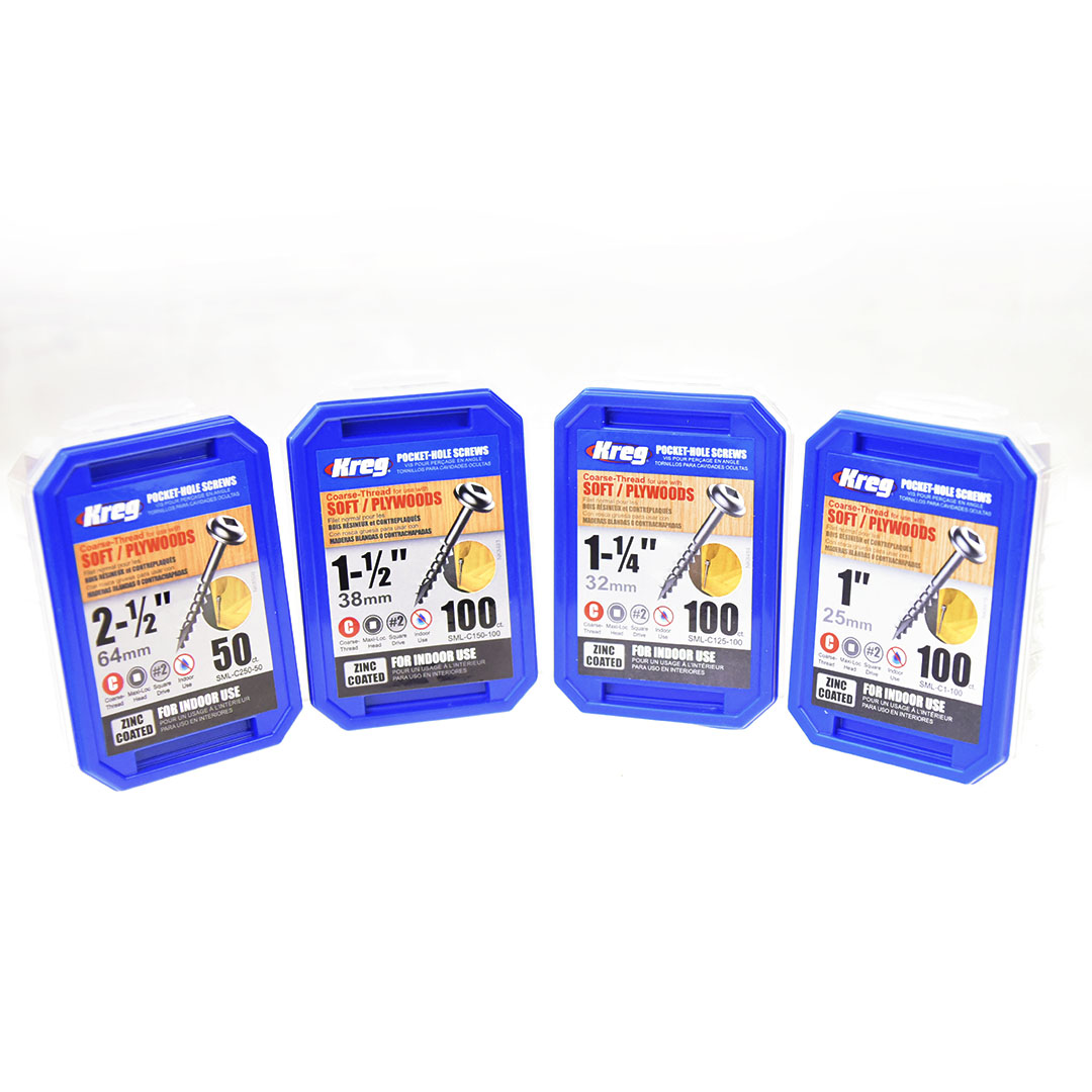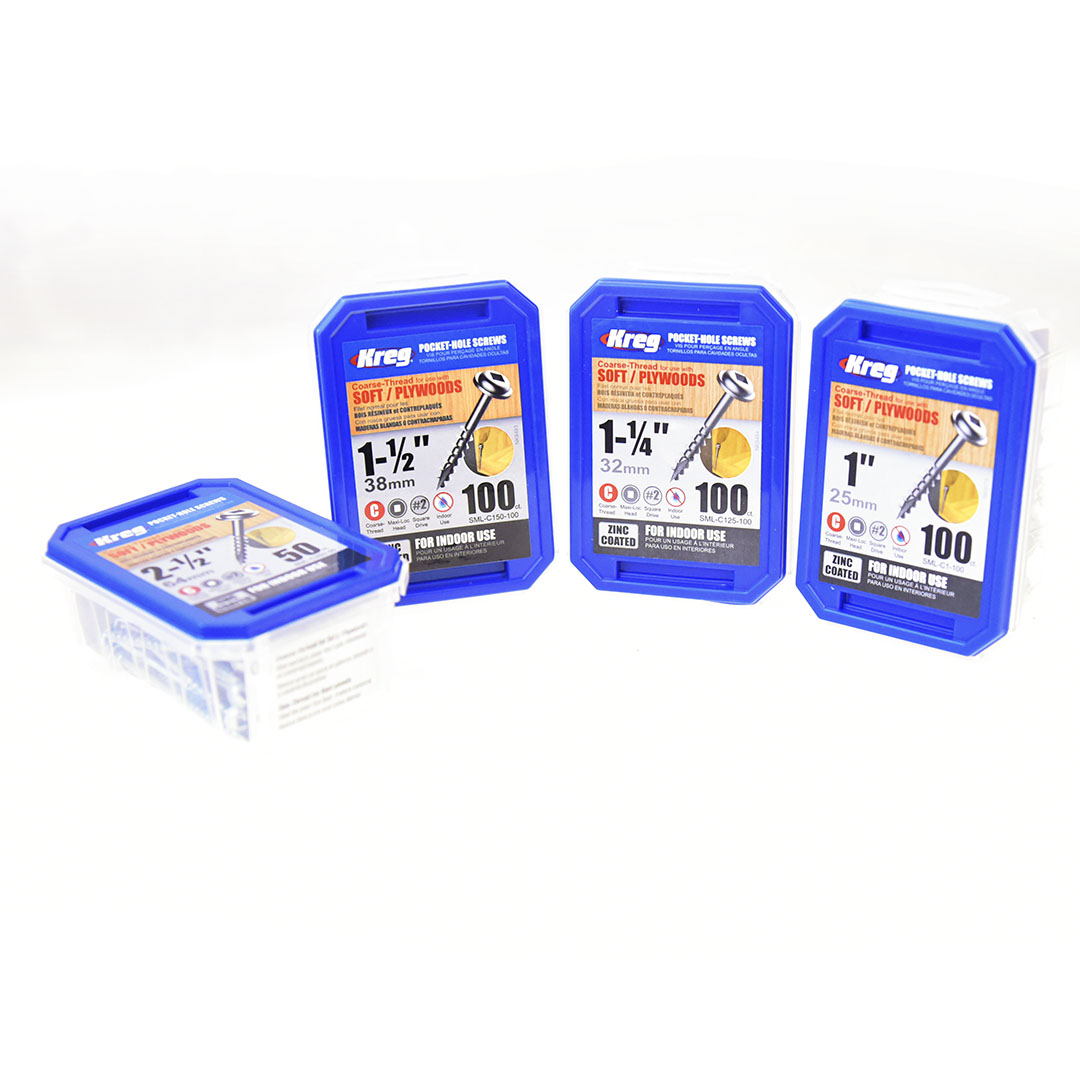 Винты Kreg Zinc являются хорошим выбором для широкого спектра работ в помещениях. Винты из цинка обладают достаточной защитой от ржавчины и служат доступной альтернативой нержавеющей стали. Шаг резьбы крупный для надежного скрепления мягких пород дерева и фанеры. Шурупы расфасованы в удобные контейнеры.