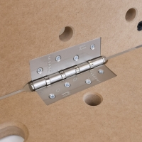Столешницы раскладываются с помощью стальных петель и крепятся к подстолью при помощи колков, устанавливаемых по углам с обратной стороны столешницы. (смотреть фотографию 3)