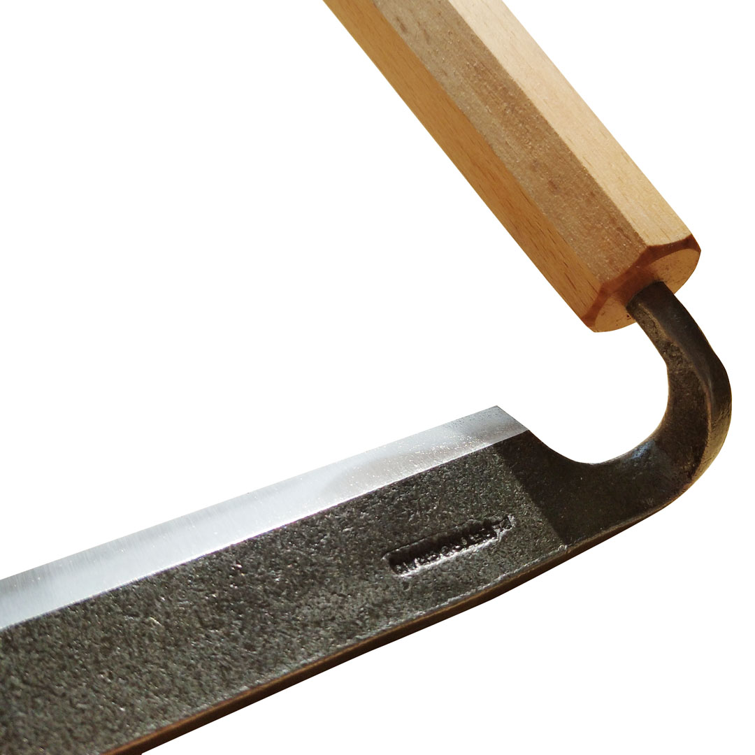 Скобель ПЕТРОГРАДЪ N11. Плоский скобель с изогнутыми и перпендикулярными режущей кромке рукоятями будет удобен при различных операциях как в плотницком деле так и в столярном: точная подгонка бревен в размер, изготовление сидений кресел, быстрый съем материала в столярном деле и пр.. Рукояти приподняты над плоскостью лезвия и позволяют работать вплотную к обрабатываемой поверхности. Лезвие отковано вручную из инструментальной стали 9XC и закалено до 55...58 HRC. Заточка - фаска вверх. Рукояти длиной 140 мм выполнены из бука и покрыты маслом. Длина режущей части - 170 мм или 270 мм, ширина 29-32мм. Толщина лезвия - 6 мм, угол заточки - 30 град. Поставляется в кожаном удобном чехле с застежкой на кнопках. Конструкция скобелей, а также их заточка рекомендована «Союзом плотников» для окорочных и плотницких работ по подгонке бревен. Для других плотницких и столярных работ возможно потребуется переточка. Закалка скобелей сквозная , это позволяет неоднократно производить как доводку инструмента , так и полную его переточку.