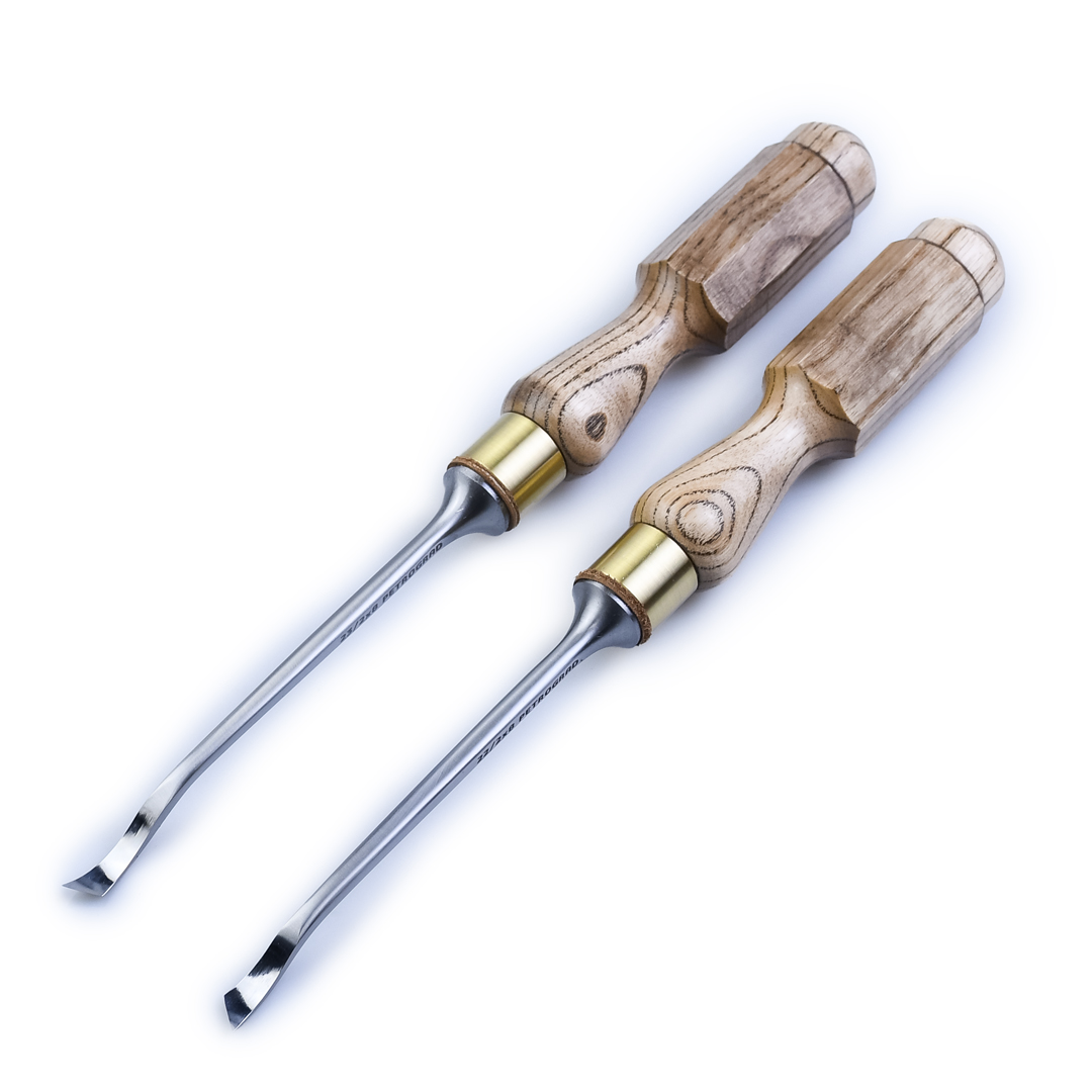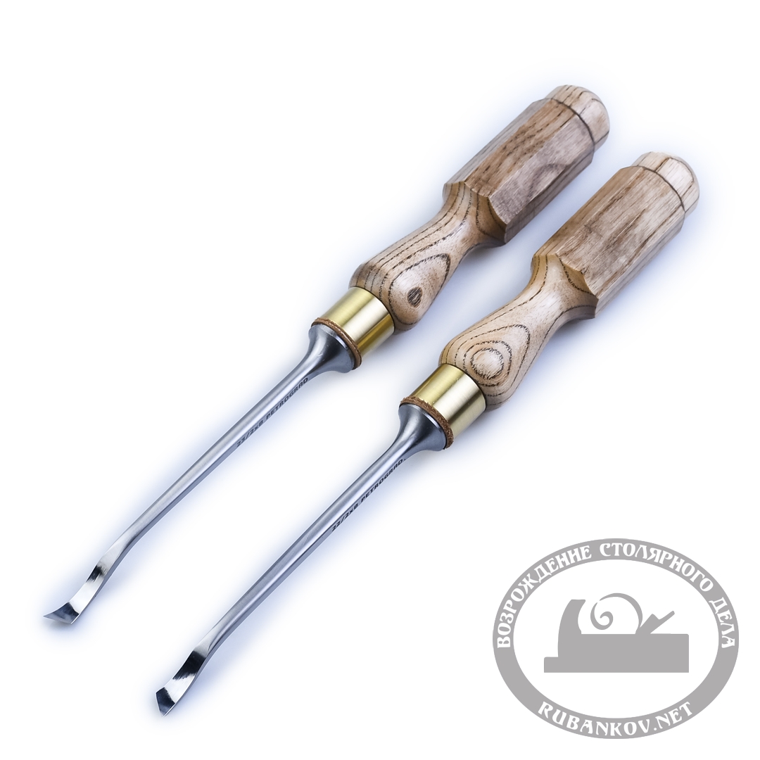 Стамески для резьбы по дереву Петроградъ откованы из низколегированной высокоуглеродистой стали. Закалены до твёрдости 59-61 HRc. Внутренний профиль стамески отполирован, режущая кромка заточена и готова к работе.