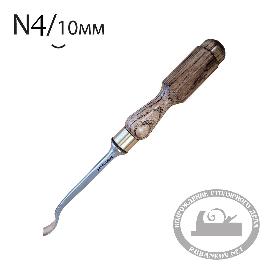 Стамеска для резьбы по дереву Петроград клюкарза N4, 10мм. Стамеска предназначена для создания ложек, кукс, а также прекрасно подойдет для резьбы по дереву. Стамески клюкарзы используются для выполнения глубокой барельефной резьбы. Также удачно подходят для декорирования деревянной поверхности. Производство Фабрика Петроградъ (Россия)