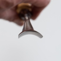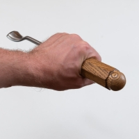 Ручка стамески выполнена на английский манер, знаменитый лондонский паттерн (англ. Londons pattern). Такая ручка удобно сидит в руке, может быть использована с различным хватом и никогда не скатится с рабочего места. Ручки стамесок выполнены из древесины ясеня с последующей обработкой и финишным покрытием тонированным маслом. Надежная фиксация полотна в рукояти производится с использование клея с последующим укреплением латунным кольцом. Торцевая часть рукояти закрыта кожаной проставкой предотвращающей попадание влаги.