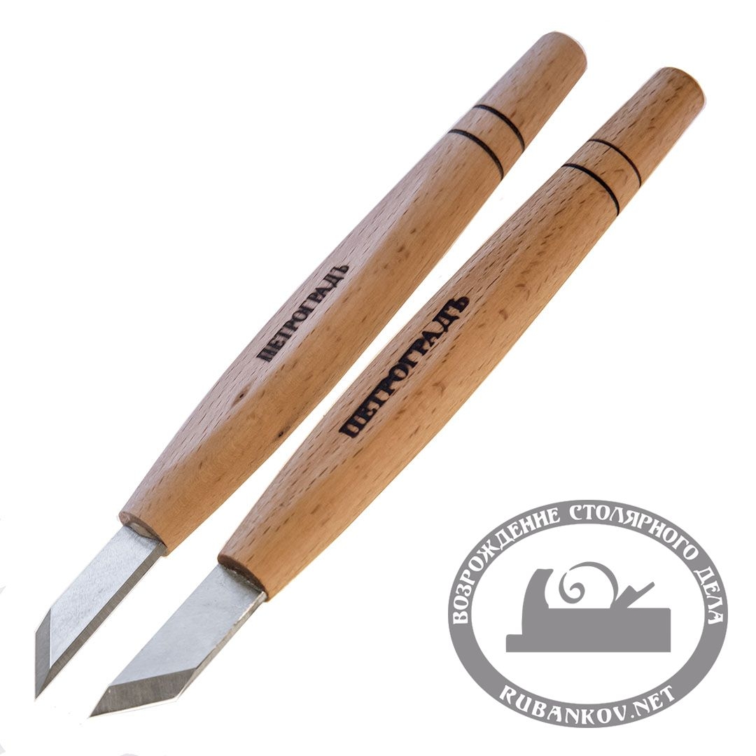 Стамески резчицкие, ПЕТРОГРАДЪ, косая заточка. Производство - фабрика столярных и плотницких инструментов ПЕТРОГРАДЪ. Инструмент представлен линейкой косых стамесок с углом скоса 45 градусом и шириной клинка 12 мм. Стамески выполнены из высокоуглеродистой стали и имеют рукояти из ценных пород древесины, покрыты маслом. Длина клинка - 35 мм, общая длина - 180 мм, угол заточки - 30 градусов, толщина клинка - 2 мм.