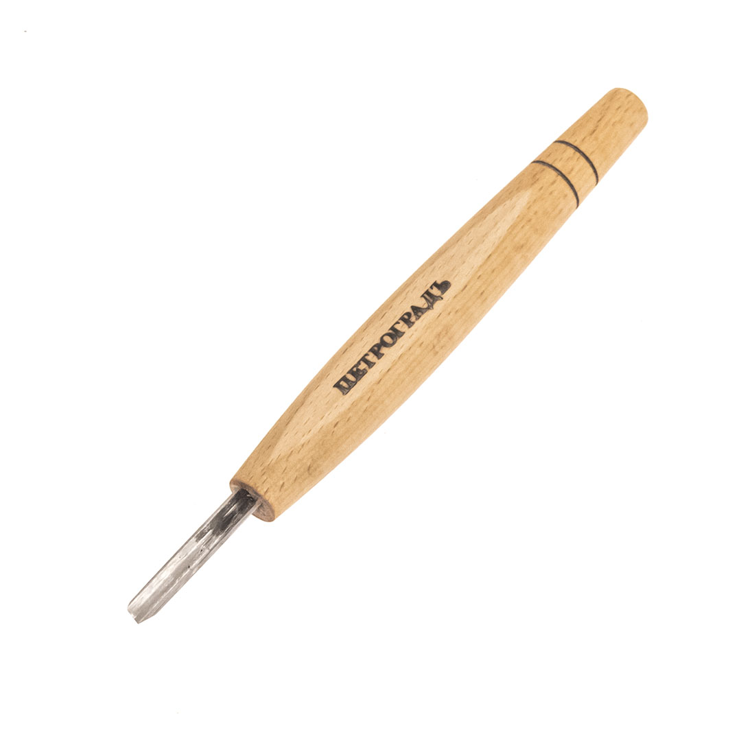 Стамеска "уголок" для резьбы по дереву. Резец предназначен для резьбы средних деталей и деталировки малых форм, так же может использоваться как инструмент для разметки при Чекиренге (насечке на прикладах). Производство фабрика Петроградъ (Россия)