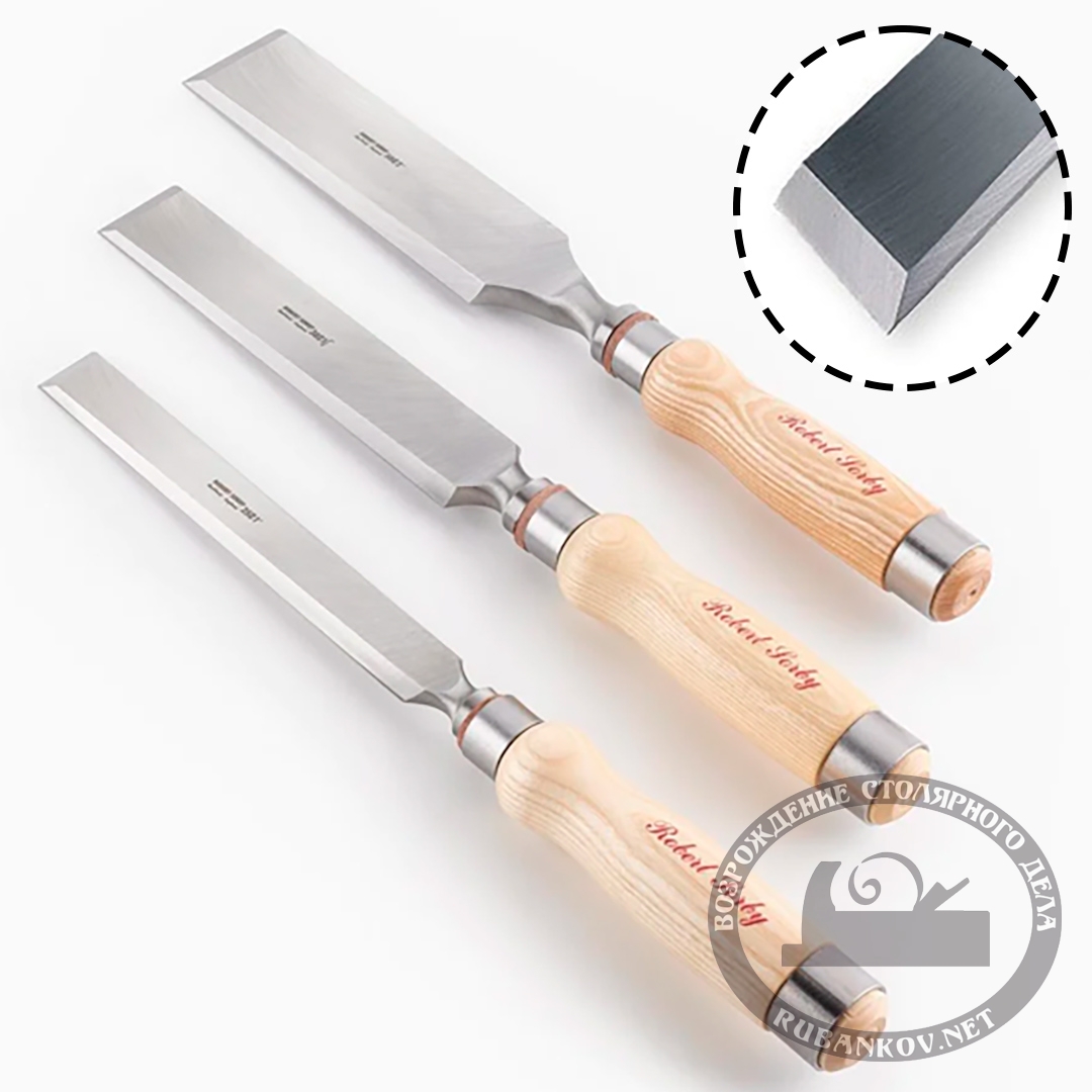 Английские плотницкие стамески из Шеффилда под маркой Robert Sorby. Эти уникальные мощные стамески были разработаны совместно с профессиональными плотниками. Предназначены для обработки глубоких пазов в бревнах. Представляют собой укороченный вариант 285 серии с дополнительными боковыми скосами для более чистой работы. За счет двух мощных обжимных колец на концах рукояти и прочного лезвия выдерживают большую нагрузку и позволяют работать киянкой. Для предотвращения повреждения заготовки в месте соединения рукояти с лезвием вставлено кожаное кольцо. Выполнены из специальной шеффилдовской стали прошедшей закалку по специальной технологии, что позволяет получить стамески с прекрасным балансом режущих свойств и прочности. Гарантией 100% качества является небольшая ямка на спинке стамесок - след от алмазного конуса прибора по определению твердости. Такой тест проходит каждая стамеска. Ручное изготовление и заточка. Стамески имеют основной скос под углом 20 градусов и микроскос под углом 25 градусов. Для работы необходимо слегка довести. Удобная длинная рукоять из ясеня. Каждая стамеска маркируется размерами в миллиметрах и дюймах. Длина лезвия 229мм, полная длина 394мм. Толщина лезвия 6.5 -9.5мм. Производство - Robert Sorby (Шеффилд, Великобритания)."