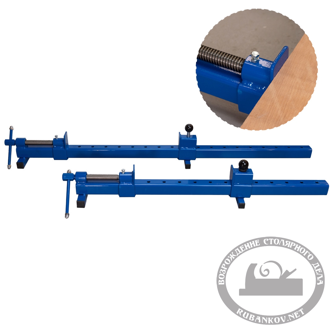 Металлическая струбцина выполнена из трубы квадратного профиля с толщиной стенок 3 мм. Корпусная струбцина оборудована винтовым зажимом с т-образной рукоятью и силовой резьбой. Так же оснащены переставной упорной планкой на пружинном механизме для удобства перемещения одной рукой. Для работы в качестве ваймы для склейки мебельных щитов, каждая струбцина снабжена парой ножек с пластиковыми заглушками, чтобы в ножки не попадала грязь.