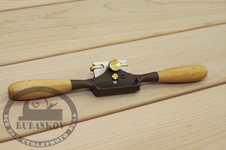 Стружок с полукруглой колодкой, отлитой из стали. Радиус подошвы - 40мм, длина - 280мм, масса - 320г. Нож из высокоуглеродистой инструментальной стали SK-4 (Состав: C 0.90-1.00%, Si ≤0.35%, Mn ≤0.50%, P ≤0.03%, S ≤0.03%, Cr ≤0.20%, Ni ≤0.25%, Cu ≤0.30%) толщиной - 3.0 мм, шириной -50мм. Положение ножа регулируется с помощью 2-х винтов, что дает раскрытие ротка до 0.5-0.8мм. Нижняя часть зажима ножа скошена под углом, для лучшего отвода стружки. Рукояти из бука. Материал винтов - латунь. Предназначен для строгания поверхностей изогнутых и округлых форм. Производство Тайвань (под маркой Dick)