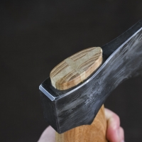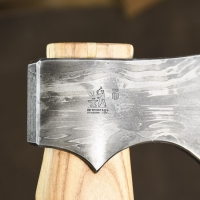 Топор выполнен по традиционной технологии "санмай", пришедшей к нам с востока. В Японии данная технология использовалась для изготовления инструментов и оружия (в том числе мечей самураев). В данном топоре используется моносталь на лезвие (65г) и дамасская сталь в качестве обкладок (65г и Ст20). Моносталь даёт отличные рубящие свойства и устойчивость режущей кромки и обуха к нагрузке, а обкладки из более мягкого и вязкого дамаска уменьшают вероятность появления трещин на проушине при ударных нагрузках, что часто бывает с топорами выкованными из цельного куска стали. Также сложная многослойная структура позволяет снизить отдачу и вибрации при рубке.