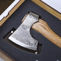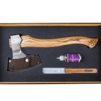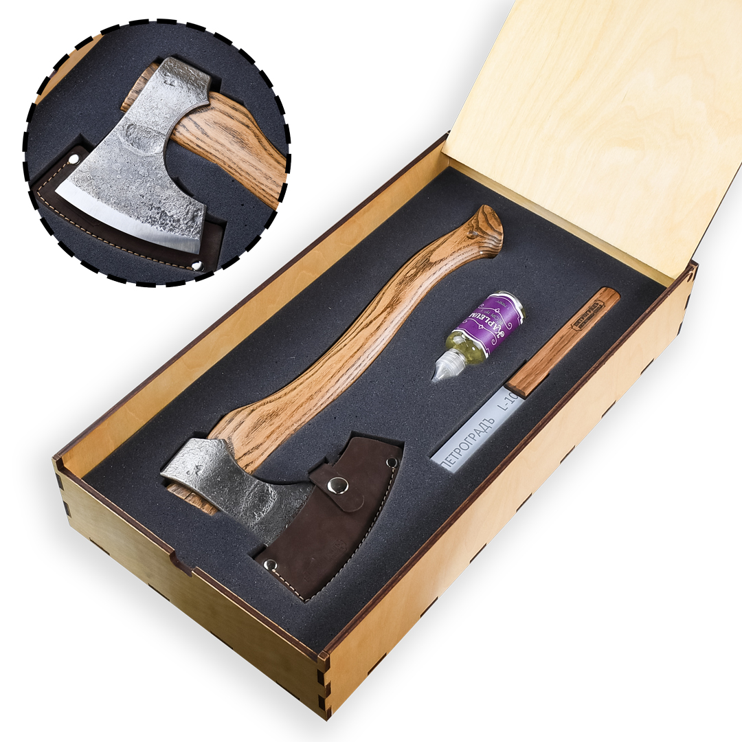 - Комплектация: кожаный чехол, масло камелии для ухода за топором, заточной камень для топора, подарочный ящик с ложементами