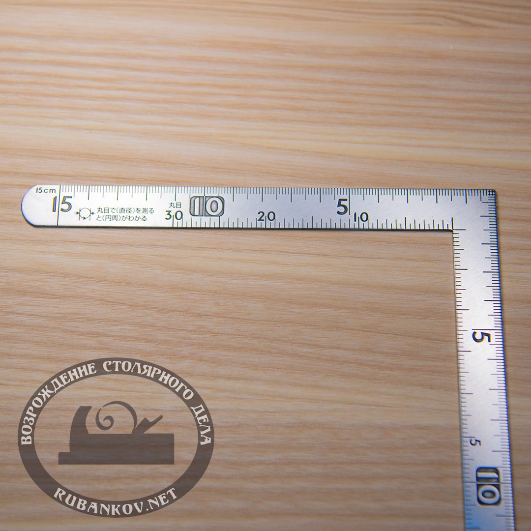 Угольник изготовлен из нержавеющей стали с матовой шлифовкой (не бликует). Разметка легко читается благодаря нанесению методом гравировки, что так же позволяет удобно снимать размеры циркулем. С каждой стороны угольника имеется два типа разметки: для нахождения расстояния от внешнего угла и для нахождения диаметра по длине окружности и по описанной окружности.