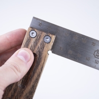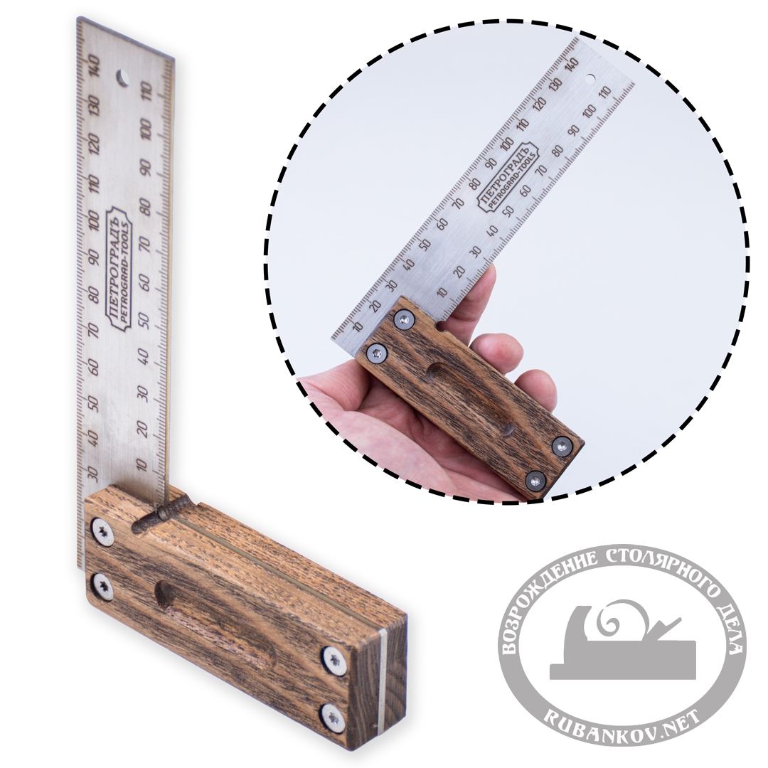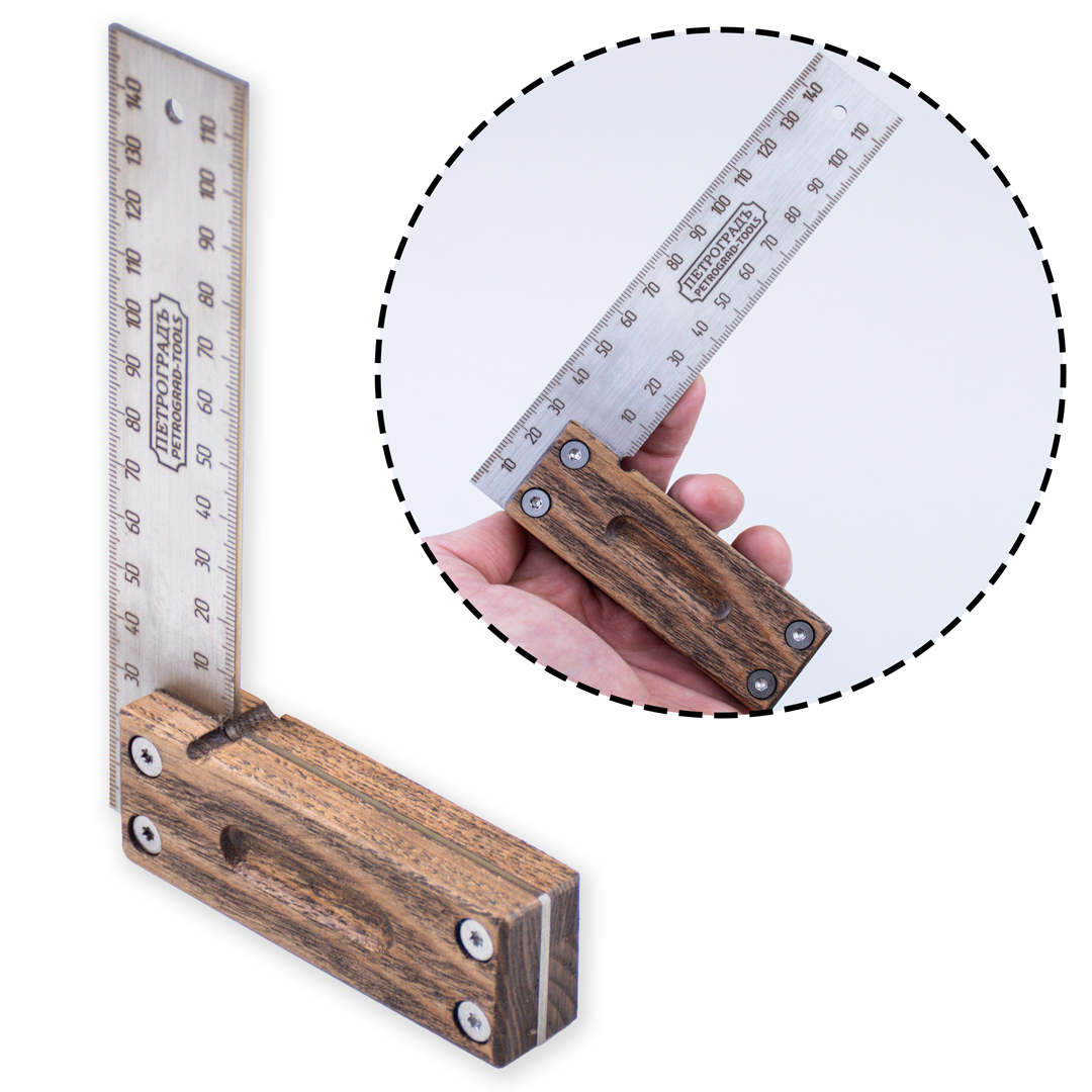 Угольник столярный ПЕТРОГРАДЪ, с подошвой, модель 2, 150мм. Толщина пера - 2мм, материал - нержавейка, лазерная гравировка с четырёх сторон. Перо вырезано в виде букв "Г"; за счёт этого проблема расшатывания в месте соединения пера и подошвы, характерная для многих других угольников, в этой модели отсутствует. Производство – фабрика Петроградъ (Россия).