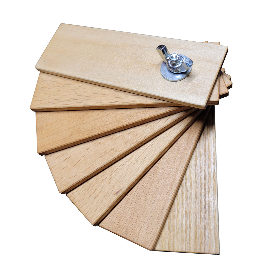 Веерная проставка для верстачных тисков. Размер 40х120 мм состоит из 7 ламелей (4,5,5,5,5,5,10 мм). Это простое устройство спроектировано таким образом, чтобы помочь предотвратить перекос и заклинивание тисков, зажимая заготовку, с одной стороны тисков. Просто установите столько веерных лепестков-проставок сколько вам нужно, чтобы толщина веерной вставки приблизительно соответствовала толщине вашей детали. При зажиме деталей толщиной более 40 мм для компенсации перекоса рекомендуется совместно с веером использовать бросовые куски древесины. Это позволяет надежно закрепить вашу заготовку и предотвращает механизм тисков от перекоса и заклинивания. Прокладки выполнены из различных пород древесины и имеют эстетический вид.