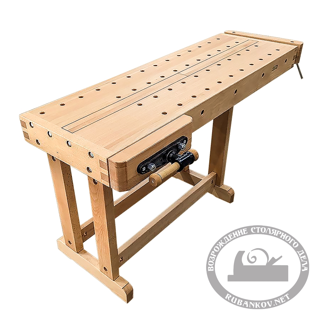 Верстак для резьбы по дереву, ПЕТРОГРАДЪ, 1500мм*500мм*800мм, с пазом. Выполнен из массива бука. Обвязочная доска высотой 120мм с соединениями на ласточкин хвост. На верстаке установлены передние и боковые тиски. Винтовые пары York. Производство фабрика Петроградъ (Россия).