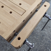 - наличие большого количества отверстий в поверхности верстачной доски позволяет располагать и фиксировать заготовку в любом удобном месте верстачной доски. Заготовки фиксируются двумя деревянными прижимами, входящими в базовую комплектацию верстака.