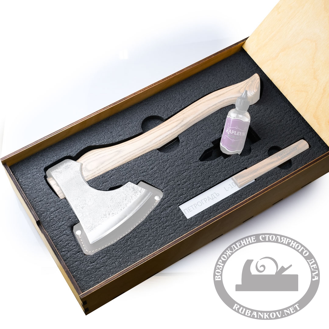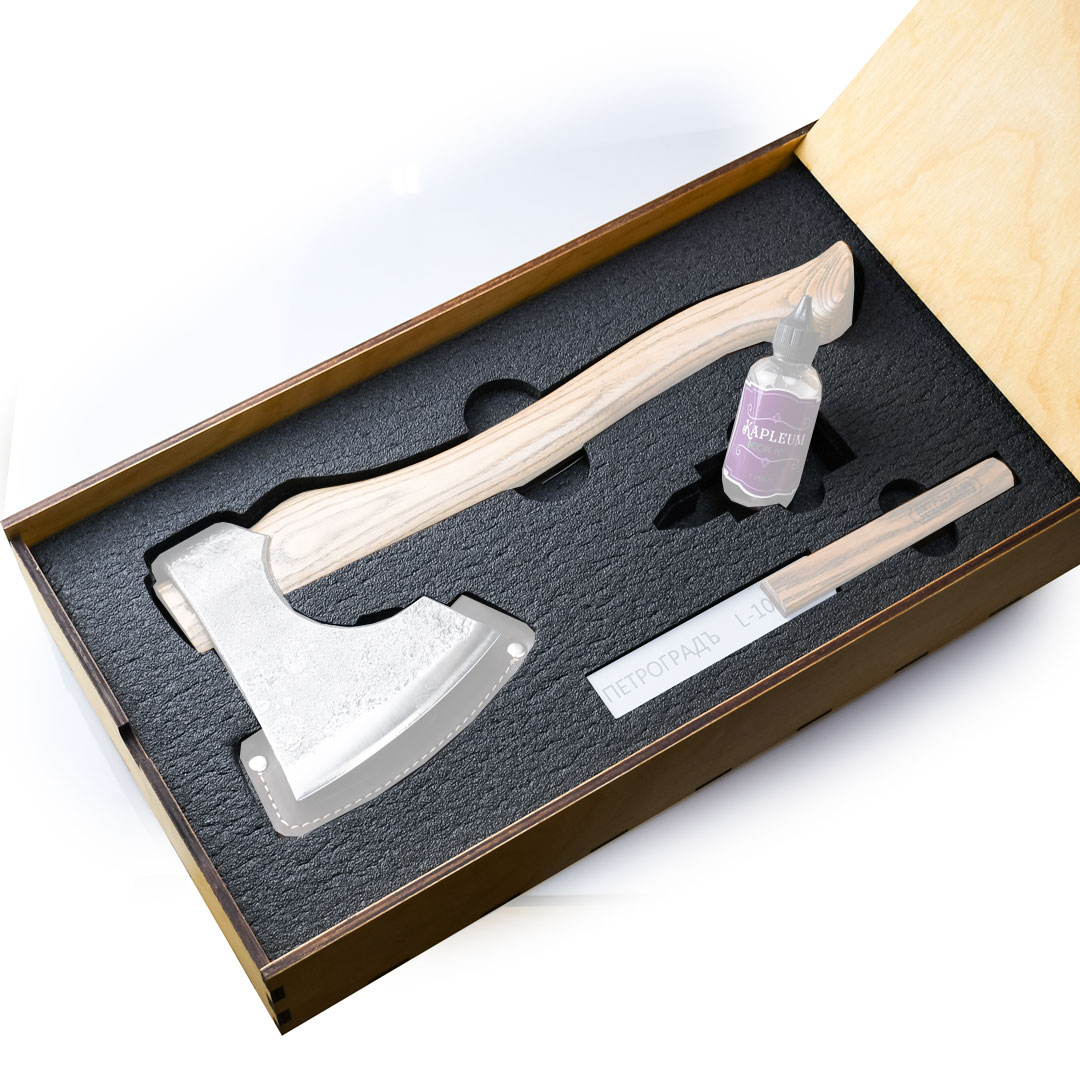Вкладыш в ящик 462мм*252мм*85мм, для топора Рославль м.7/т.11, точилки и масла. Предназначен для установки в ящик при последующей комплектации набора с топором Рославль 7.
