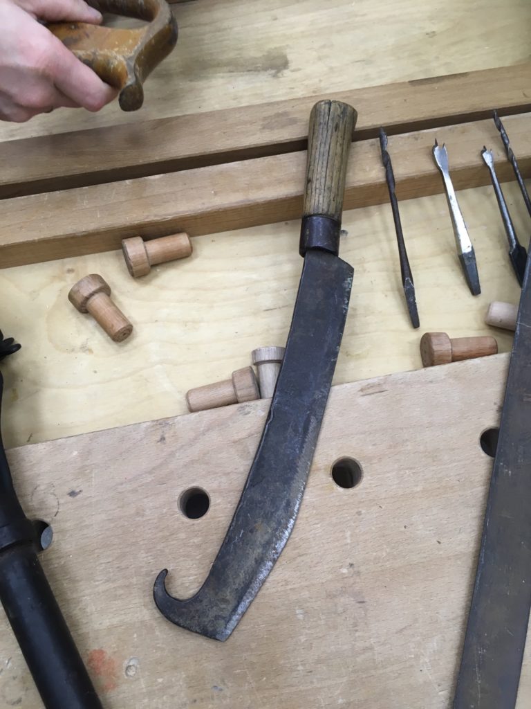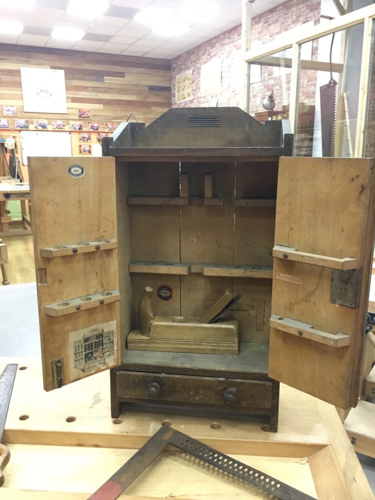 В шкафчике уютно расположились несколько инструментов для разного рода задач. Помимо рубанка на фотографии выше, там расположились кожевенный нож, нож для колки и двух сторонняя европейская ножовка. Шкафчик будет хорошим подспорье для нашей столярной школы.