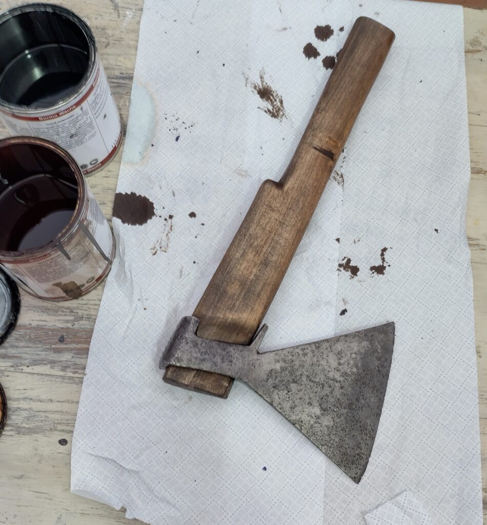 Эти майские дни не прошли даром! Мы давали мастер-класс по изготовлению топорища исторического образца, за помощь в реализации которого благодарим компанию Borma, ведь именно благодаря их маслам для тонировки удалось добиться эффекта старой древесины. На фото — русский рабочий топор с укороченным топорищем, воссозданным по фотографии середины XIX в.
