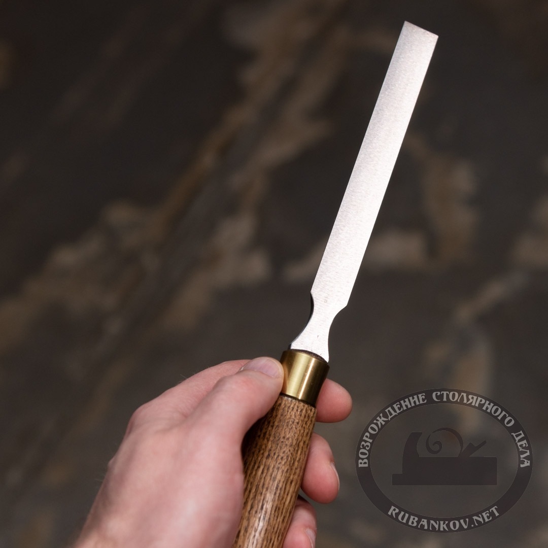 Для исследования была выбрана стамеска ПЕТРОГРАДЪ серии Волга шириной 12мм, изготовленная из стали 9ХС. Твёрдость клинка в районе режущей кромки - 59-61HRC. Надо добавить, что сталь 9ХС была разработана как раз для изготовления режущих частей деревообрабатывающих инструментов.