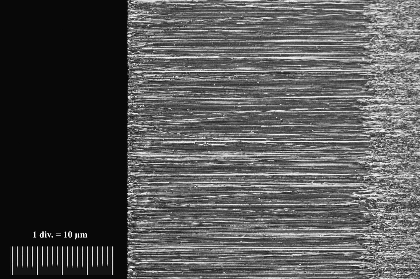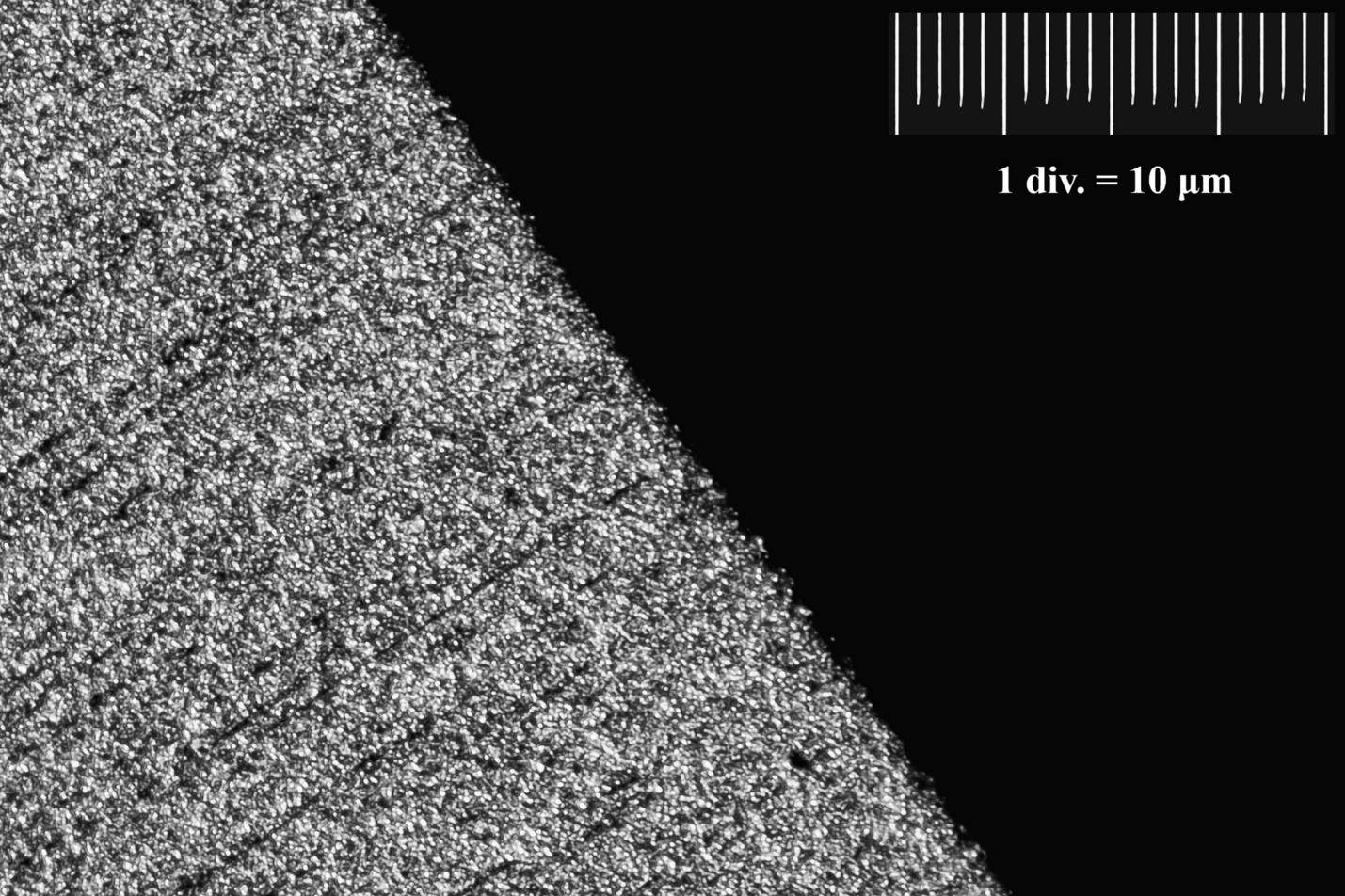 Поверхность характерна для одновременной работы свободного зерна в суспензии и закреплённого в связке, матовая, однако все еще видно направление рисок. Ширина заусенца около 10 микрометров.