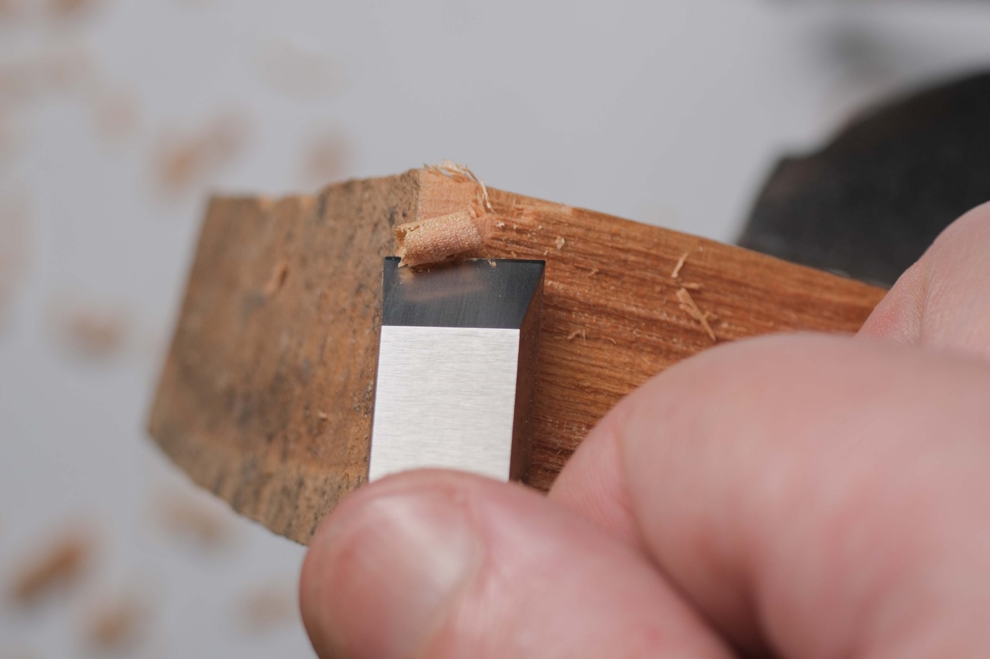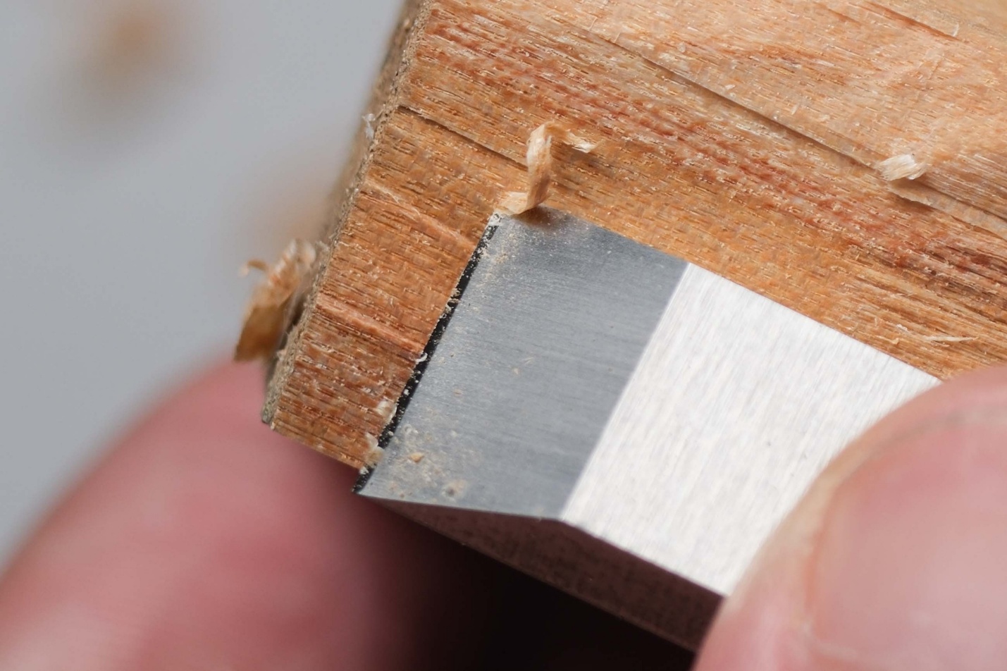 После нескольких стружек с дерева, снова проверил кромку на остроту - без изменений. Это полезно проверить, чтобы убедиться, что остра именно кромка, а не заусенец на ней, стойкостью не обладающий.