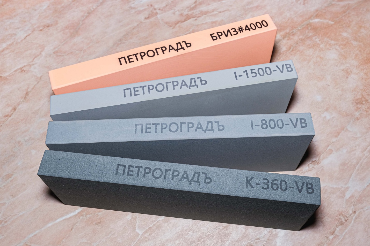 Итак, для полного обслуживания стамески 12мм. Мне потребовалось 4 бруска Петроградъ с зерном 360, 800, 1500 и 4000 грит: